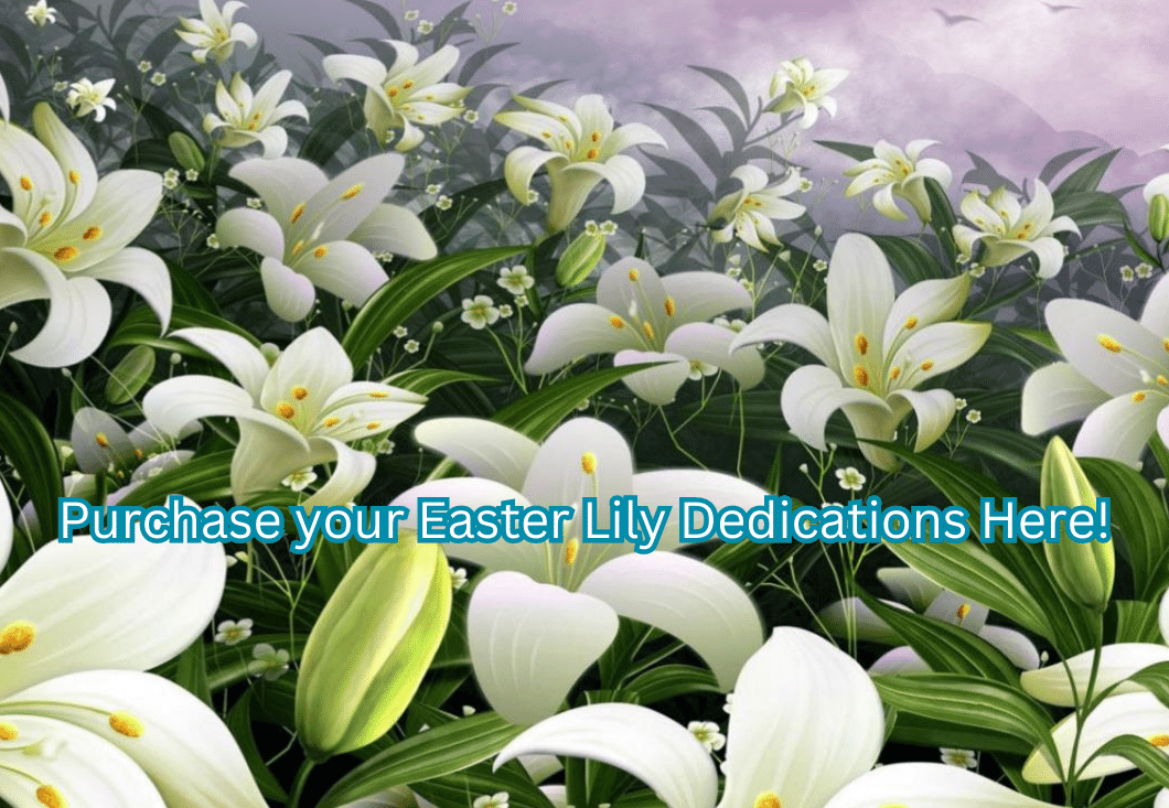 We invite you to honor someone you love, whether living or deceased, with a potted Easter Lily plant. Lilies are $15 each and will be used to decorate the sanctuary on Easter Sunday. After the service, you may take the lily home for your own enjoyment.