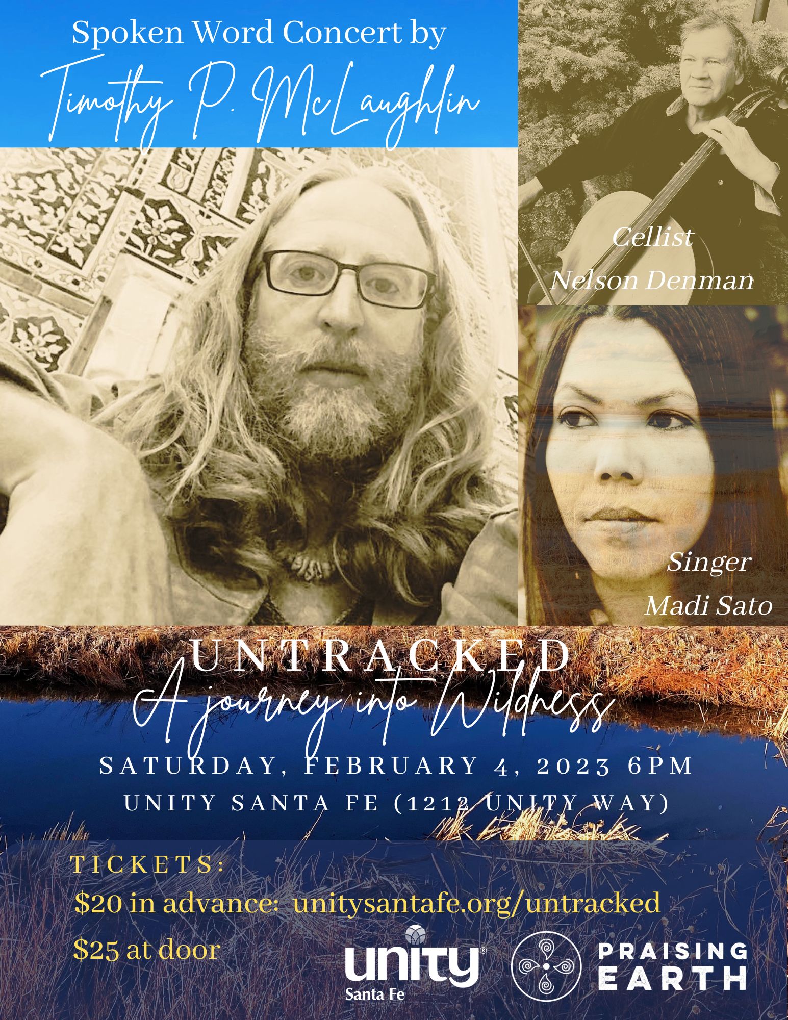 Journey into the mountains and wild places through the mythopoetic tellings of Timothy P. McLaughlin whose language and stories have been described as ‘spellbinding’ and ‘essential’. The cello of Nelson Denman beautifully complements the spoken word and songstress Madi Sato adds her haunting, soulful voice for a complete experience that is not to be missed.